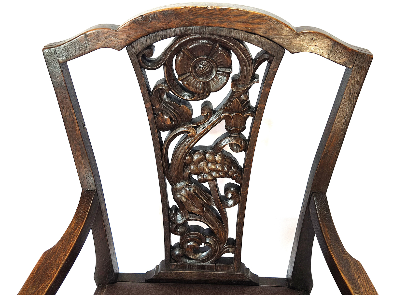 Schreibtisch-Armlehnstuhl um 1920, massiv Eiche, Sitz mit neuem Antikleder (Handwish-Nappa) bestückt und geschnitzter Lehne in Chippendale-Form